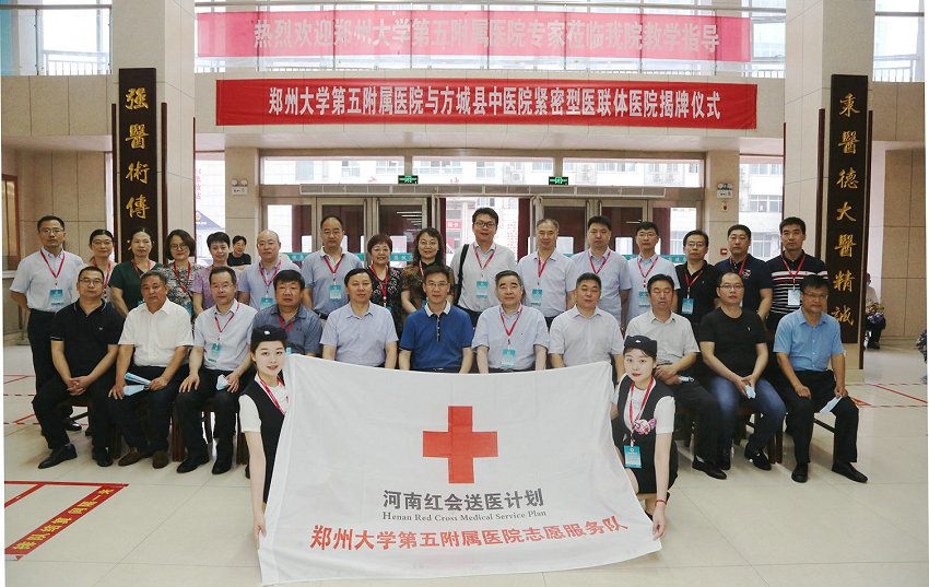 2020年6月11日上午,按照省红十字会安排,郑州大学五附院院长郑鹏远,副院长傅聿铭、朱光带领由12名医疗护理专家,院办、信息科、医保办、宣传科、医疗协作办等职能科室负责人及相关工作人员组成的志愿服务队,赴方城县参加河南省“红会送医计划”实施项目启动仪式,在当地深入开展“送知识、送技术、送服务”活动。