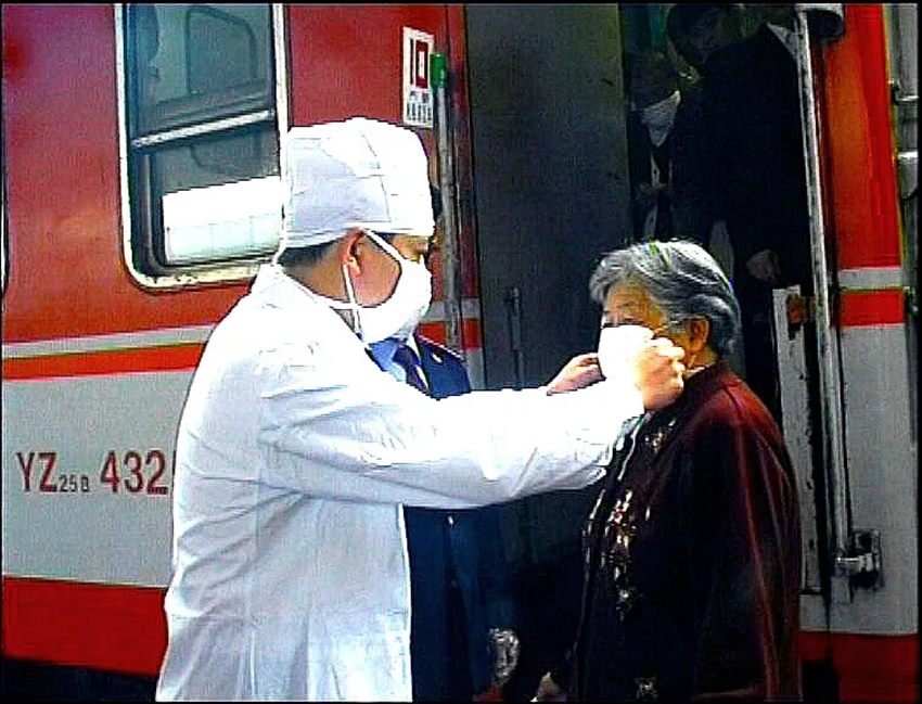 ▲ 医务人员组成的“非典”防治工作小组在铁路客车添乘