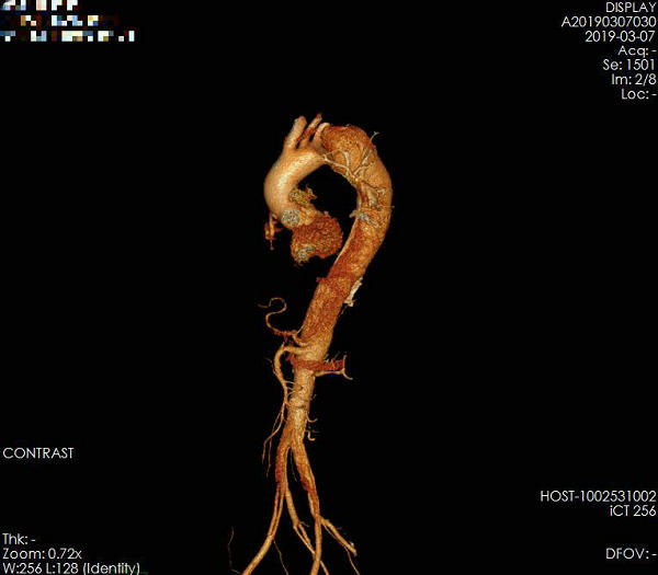 49岁的柴先生有20年的高血压病史,平时用降血压药物,血压控制不理想,近日以“突发胸背部剧烈疼痛3小时”来郑州大学五附院血管外科住院治疗。入院时查体:痛苦面容,心率72次/分,律齐,股动脉动脉搏动可。在血管外科司江涛主治医师接待病人后,迅速完善术前相关检查。胸主动脉CTA检查提示:胸主动脉夹层,DeBakeyⅢ型,破口巨大,假腔向上逆撕至累及左锁骨下动脉及左颈总动脉,主动脉弓上三分支血管距离太近,左椎动脉为优势供血动脉(图1)。